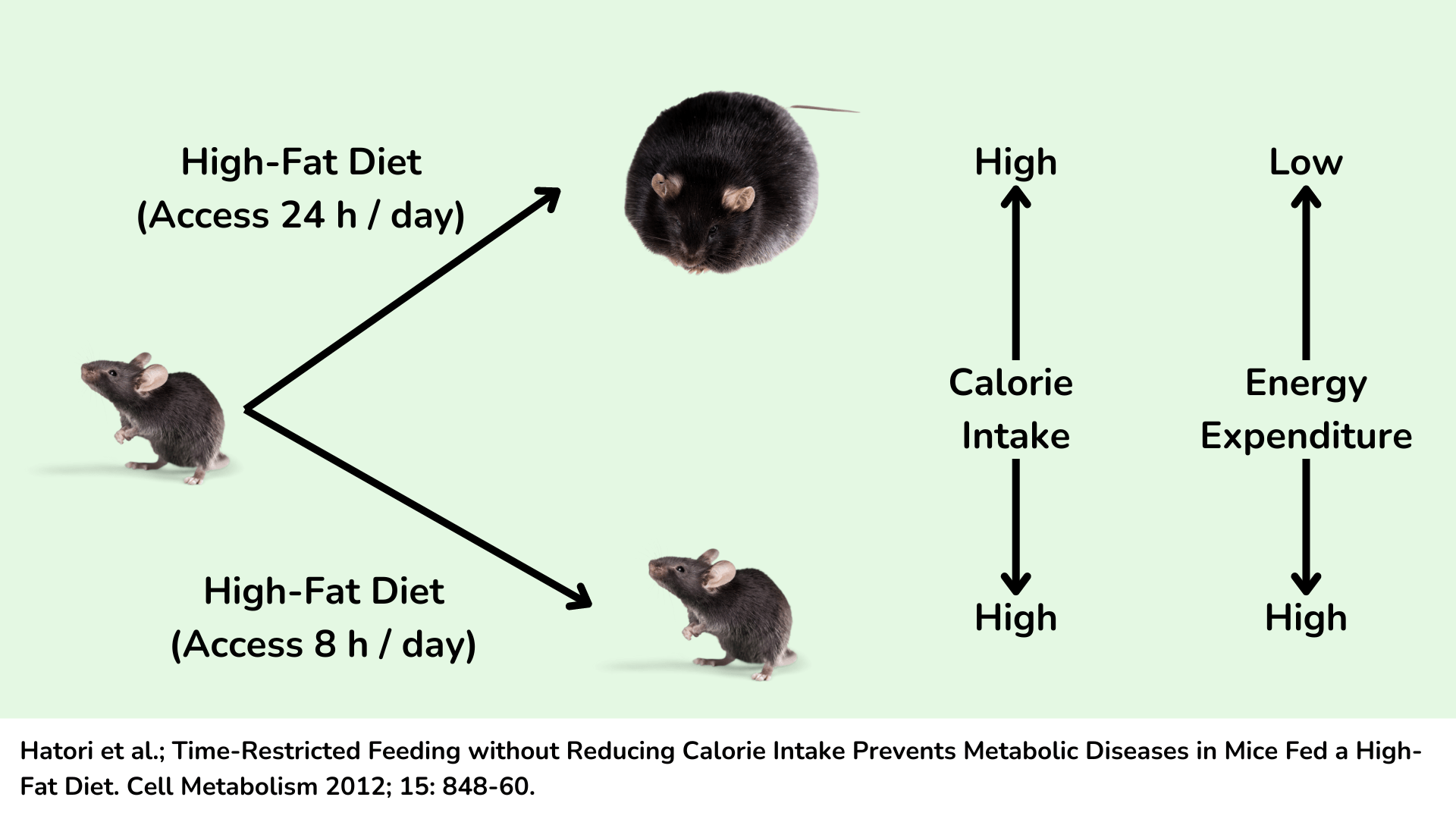 有趣的是,我们先从一项早期的小鼠研究开始,该研究让全世界对限时进食感到兴奋。在这项研究中,研究人员观察到,如果给小鼠喂食高脂肪食物,小鼠会在短短几周内暴饮暴食并变得相当肥胖。然而,他们还发现,这些小鼠非常喜欢高脂肪食物,如果它们一天 24 小时都能吃到这些食物,它们就会不断进食,甚至经常醒来吃。因此,他们会问,如果将进食时间限制在每天 8 小时内,是否可以防止这种暴饮暴食和增重。事实上,每天只能进食 8 小时的小鼠增重的幅度远不及那些全天 24 小时都能吃到高脂肪食物的小鼠。但有趣的是,这并不是因为它们吃得少。小鼠很快就知道美味的食物会被夺走,所以它们在可以吃到食物的 8 小时内吃得更多。令研究人员惊讶的是,它们摄入的热量与一天 24 小时进食的邻居一样多。那么为什么它们没有增加那么多体重呢?研究人员非常仔细地监测了这些小鼠,发现进行 8 小时限时进食的小鼠的能量消耗要高得多,这就解释了为什么没有像它们的朋友那样增加那么多体重,尽管它们吃的食物同样多。