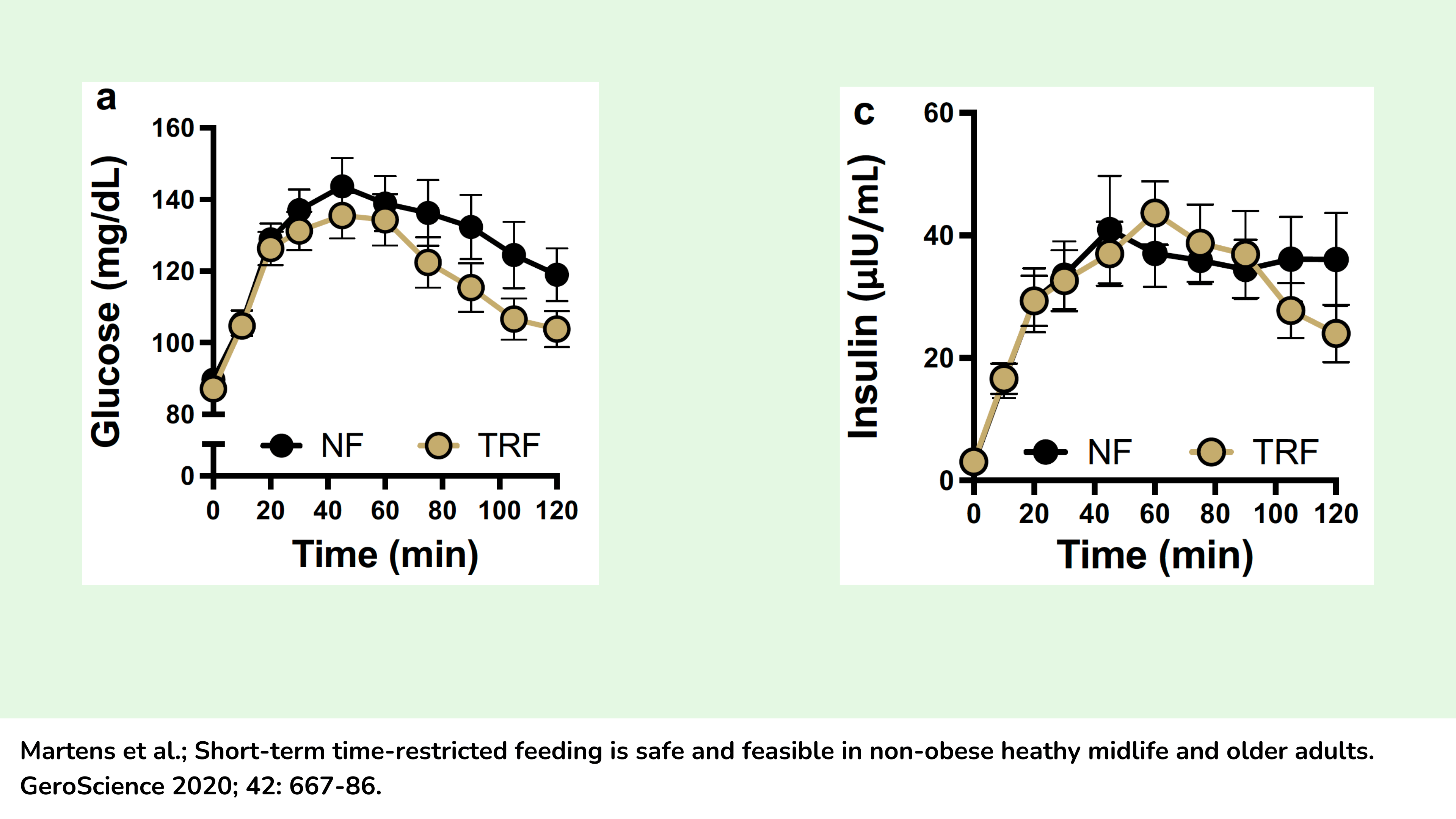 现在,更令人困惑的是,Martens 团队进行了另一项研究,其中六周的 8 小时 TRE 确实改善了葡萄糖耐受性。他们进行了 2 小时 OGTT,发现与正常喂养对照组相比,TRE 显著降低了葡萄糖曲线下面积(见下图)。同样,这与体重变化无关。