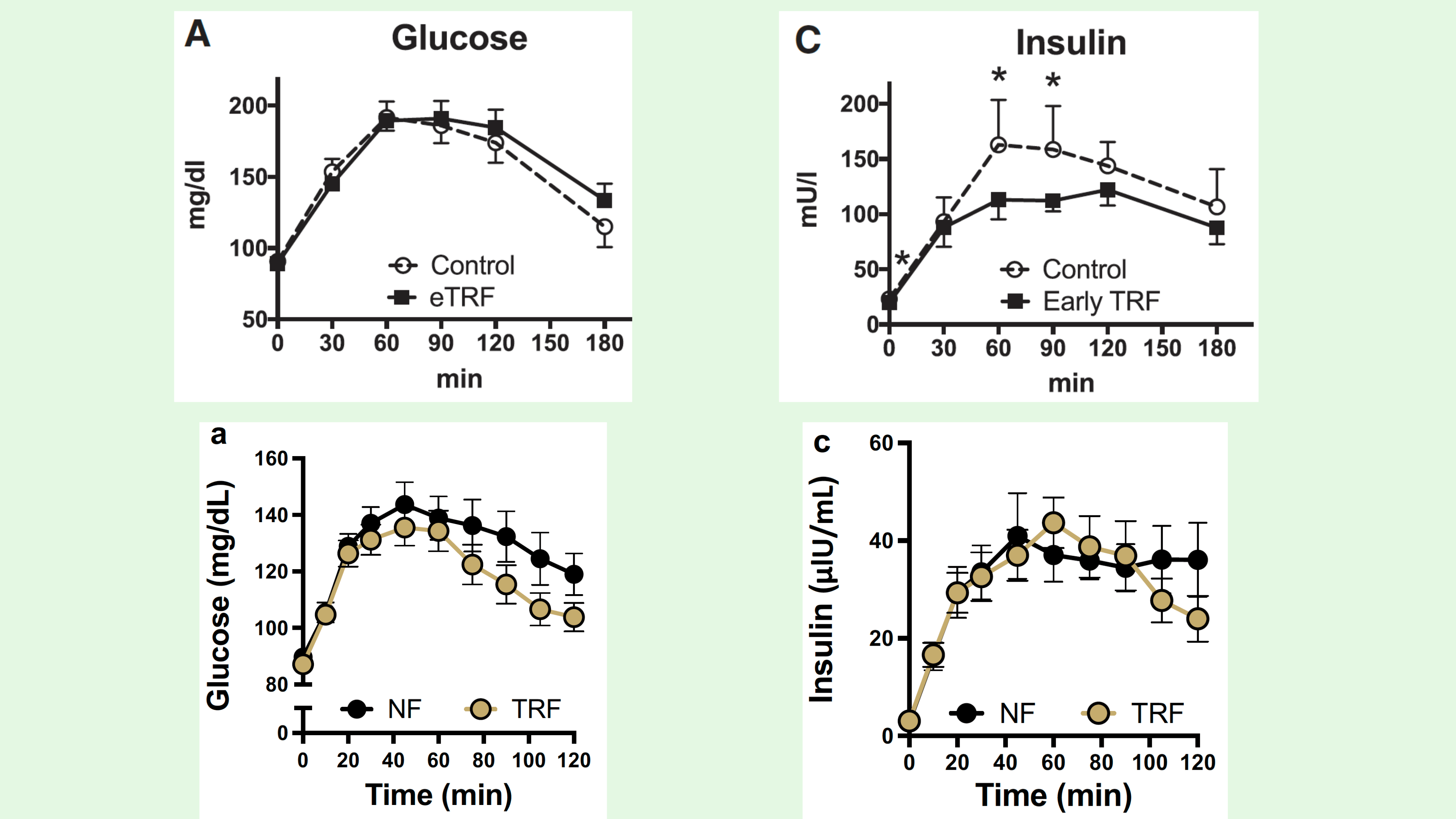 通过 2 小时口服葡萄糖耐量测试 (OGTT) 测量限时饮食与正常喂养 (NF) 控制对葡萄糖耐量和胰岛素敏感性的影响。通过 2 小时口服葡萄糖耐量测试 (OGTT) 测量限时饮食与正常喂养 (NF) 控制对葡萄糖耐量和胰岛素敏感性的影响。