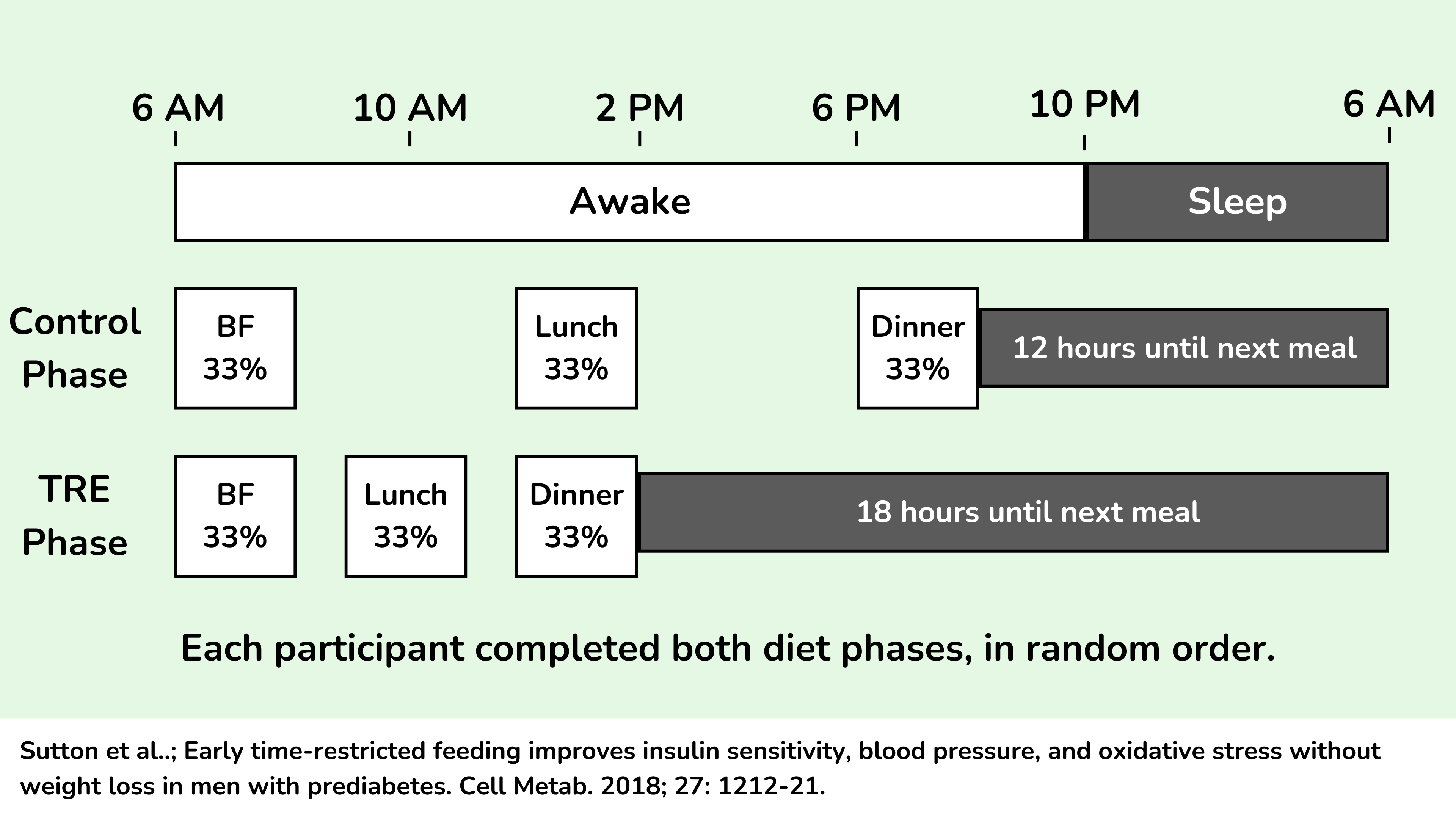 Sutton 团队也使用了类似的研究设计。他们招募了患有糖尿病前期(这意味着具有胰岛素抵抗和中度葡萄糖不耐受)的参与者。他们再次进行了一项交叉设计试验,其中每位参与者完成两个为期 5 周的干预期。在两个干预期中都吃了所有饭菜。在一个阶段,在一天早些时候 6 小时内吃完这些饭菜,意味着遵循 6 小时的早 TRE。在另一个阶段,在 12-13 小时内进餐(见下文的研究设计)。因为在这次试验中,相同的参与者吃了相同的热量相同的饭菜,所以这只是对 TRE 的真正调查,因为体重和体脂在这两个干预期之间没有发生差异变化。