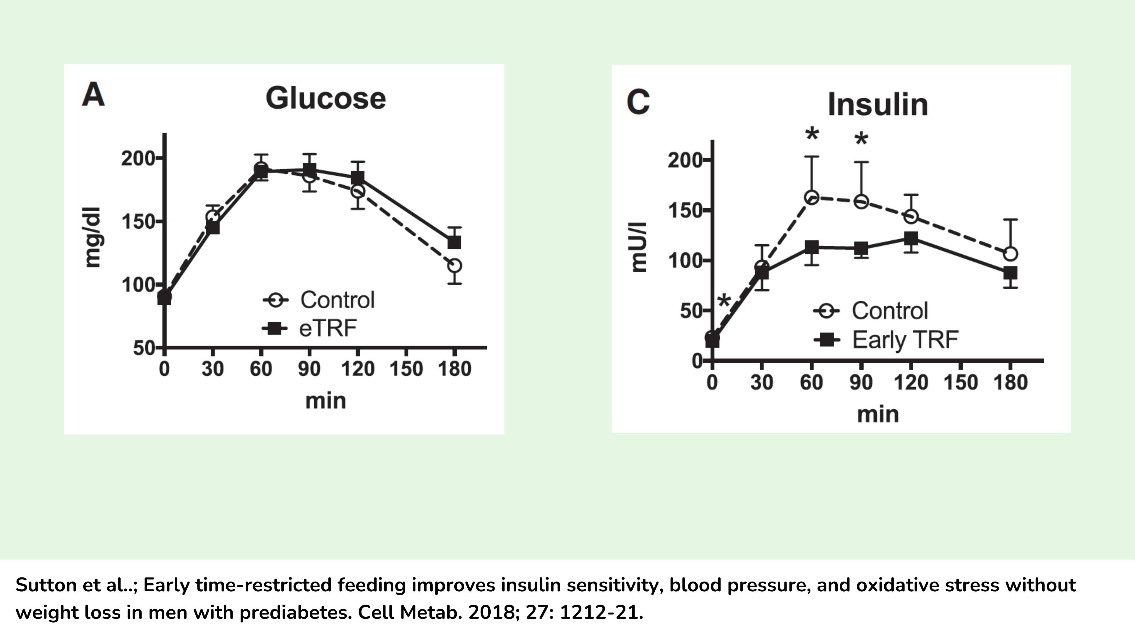 五周结束时,这些研究人员进行了 3 小时的 OGTT。他们发现,早 TRE 阶段和控制阶段的葡萄糖耐受性没有差异。参见下图,两个干预期结束时的血糖反应几乎完全相同。然而,参与者在 TRE 阶段结束时需要更少的胰岛素来调节血糖水平,因此在 TRE 阶段之后的整个测试中,胰岛素浓度要低得多。这意味着他们对胰岛素更加敏感。这些作者还报告说,早 TRE 后,β 细胞功能得到改善。可以从这项非常好的试验中自信地得出结论,TRE 可以改善胰岛素敏感性和 β 细胞功能,而不受体重和脂肪质量变化的影响。然而,胰岛素敏感性和胰岛素分泌的改善并没有转化为更好的葡萄糖耐受性,这是一个有点不寻常和意外的发现。通常,仅凭这种程度的胰岛素敏感性改善就有望改善糖尿病前期患者的葡萄糖耐受性。
