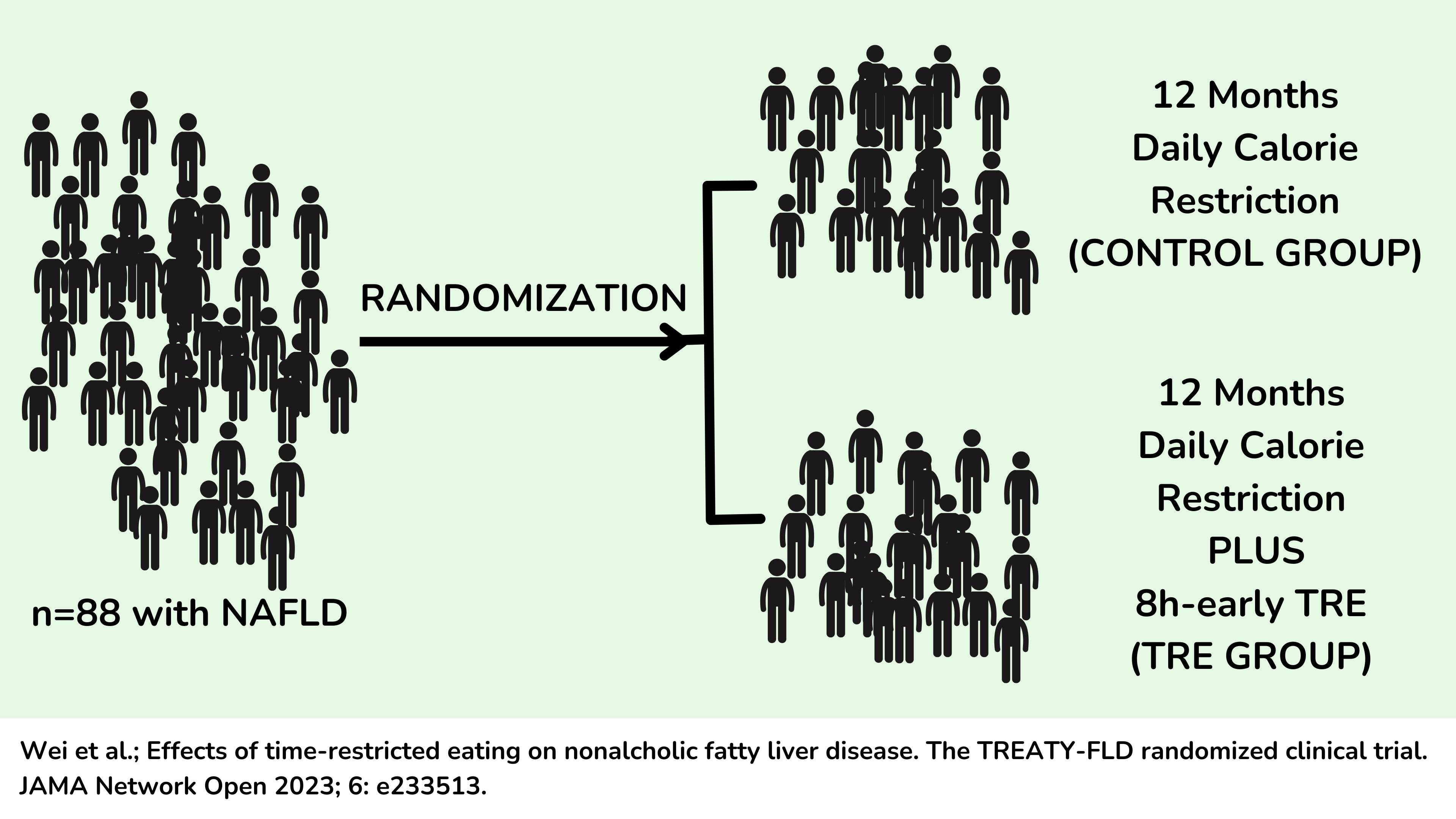 首先,我想分享一项高质量试验的数据,该试验研究了限时进食对内脏和肝脏脂肪的影响。Wei团队的这项试验于去年发表。他们招募了 88 名患有肥胖症和非酒精性脂肪肝病 (NAFLD) 的参与者,随机分为两组:一组限制每天的热量摄入量,持续一整年(对照组);一组限制热量摄入量,同时遵循 8 小时早TRE限时进食,仅在上午 8 点至下午 4 点之间进食。