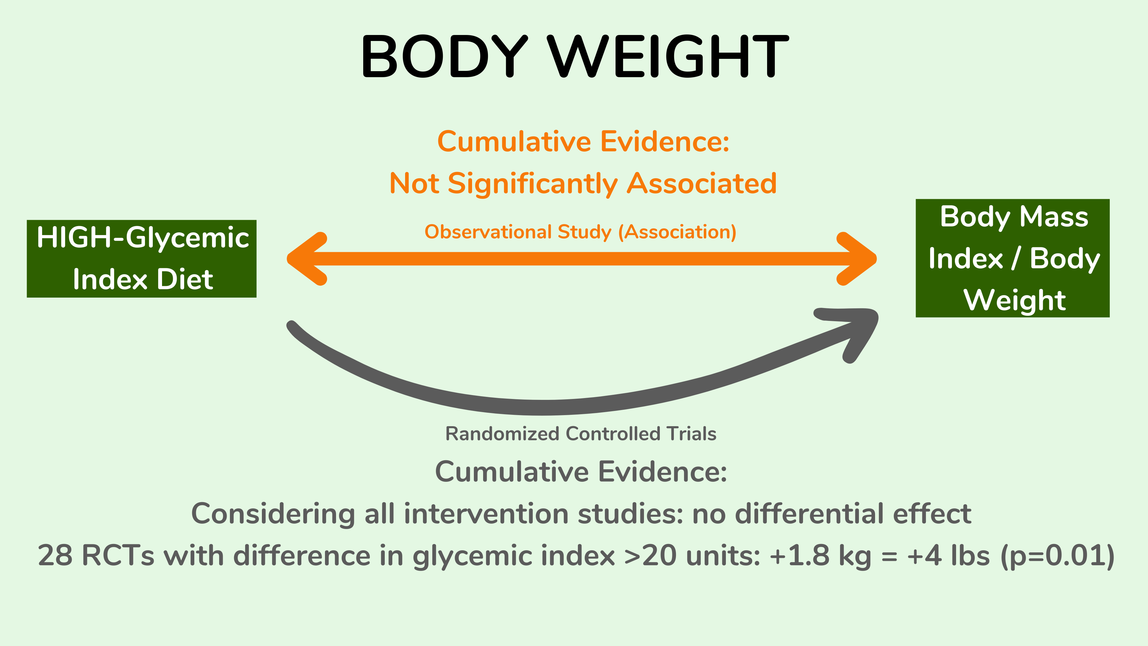 • *2023 年 1 月 26 日下午 11:06 您能否写一篇文章解释一下脂肪和蛋白质如何以不同的方式降低碳水化合物的血糖反应,并深入探讨其中的科学原理?我还想看一篇关于脑雾/认知功能障碍的文章,以及为什么有些人在饭后会出现这种情况,以及 3 型糖尿病是否属实? 加载中… 回复 - 7209fe756c543914dcc5b6dc9eafd49b马里奥·克拉茨 说道: 2023 年 1 月 27 日凌晨 1:06 感谢您提出的优秀建议。 加载中… 回复 - 2dab8c929b2556c0b56dd38d57810865Christian Quirós 说: 2023 年 5 月 14 日上午 9:59 你好,非常感谢您的内容。 1. 您是否有 Patreon,以便小费可以自动重复而不是一次性? 2. 你能制作一个海报版本,其中包含一餐的典型份量吗?在评估血糖负荷时,手边有它会很有帮助 此致敬礼, 克里斯蒂安。 加载中… 回复 - 7209fe756c543914dcc5b6dc9eafd49b马里奥·克拉茨 说道: 2023 年 5 月 14 日下午 12:56 嗨,克里斯蒂安, 谢谢。您考虑留下小费真是太好了。不过,目前我还没有 patreon 帐户。我希望长期建立一些实际上也能为人们带来额外价值的东西(而不仅仅是给我小费……;-),比如一个有实时通话的在线社区,它还允许成员相互交流,并成为存储特定主题、食谱等指南的地方。不过,这需要一些时间来建立,我首先需要弄清楚是否有足够的兴趣。 关于你的第二个问题,我最初是这样做的,但结果变得非常丑陋和混乱,特别是因为我必须提供以克或毫升为单位的份量,以及(对我的大多数美国观众来说)盎司和液体盎司。这真是一团糟。我觉得 GL 值仍然有用,因为我认为人们对这些食物的典型份量大致了解。 不过,这里有一个想法:我可以在海报的第二页上添加份量大小,打印在背面!?这可能很容易,而且做起来很快。没有听到其他人说他们错过了份量大小,但我同意你的观点,这会很有用。 干杯 马里奥 加载中… 回复 - 366abbeb4caf470aaaac084d7de16a74彼得 说: 2024 年 6 月 8 日上午 11:52 嗨,Mario,首先非常感谢您的工作,这对我很有帮助。 对于这个问题,我发现计算 GL 的份量大小也很有用,例如米饭可以作为配菜和/或意大利烩饭等食物的基础,所以我很难进行比较。同时,我不想浪费您太多时间来更新精彩的海报,所以我会很感激,即使只是将纯表格单独附在文章中,或者将其粘贴到您方便快捷的地方。感谢您的考虑! 加载中… - 7209fe756c543914dcc5b6dc9eafd49b马里奥·克拉茨 说道: 2024 年 6 月 13 日下午 4:00 彼得, 我确实应该修改这张海报,把份量也包括进去。谢谢你提醒我。 您可以在报纸上查找这些数据所基于的所有份量大小; <https://pubmed.ncbi.nlm.nih.gov/34258626/> 它在补充表 1 中。如果您无法访问该论文,请填写此网站上的联系表并提供您的电子邮件地址。 干杯 马里奥 加载中… - 58806f464ada0d0cecd805fb1f8bff53罗斯·库珀 说道: 2023 年 5 月 28 日下午 9:02 我如何才能获得 Katz 博士在其视频中推荐的血糖指数海报的副本? 加载中… 回复 - 7209fe756c543914dcc5b6dc9eafd49b马里奥·克拉茨 说道: 2023 年 5 月 29 日上午 12:58 – 下载血糖指数/血糖负荷海报的链接 – <https://nourishedbyscience.com/the-glycemic-index-and-glycemic-load-of-common-foods/> 谢谢你的关注,罗斯。 最好的, 马里奥 加载中… 回复 https://nourishedbyscience.com/the-dietary-glycemic-index-everything-you-need-to-know/ Edit:2024.11.28 ====== 血糖指数与健康结果 ====== 2023 年 3 月 1 日发布 在最近的一篇博客文章中,我谈到了血糖指数和血糖负荷。我介绍了它们的含义和计算方法,并介绍了几种常见食物的血糖指数和血糖负荷数据。 在这篇博文中,我将通过讨论我们的饮食的血糖指数是否对我们的健康有影响来扩展这个讨论。 学术界社交媒体上的 一些人似乎认为血糖指数毫无用处。他们提出的观点通常都是事实正确的,但我仍然不同意这种结论。我确实认为血糖指数有价值。然而,我们需要了解和考虑一些事情,才能让它真正有用。我写这篇文章的目的是消除这方面的任何困惑,并确保您完全了解如何利用食物的血糖指数数据为自己谋利。 ===== 血糖指数与健康结果 ===== 我们要做的第一件事是看看科学文献能告诉我们血糖指数是否对健康有影响。我们将通过研究一些健康结果的观察性和干预性研究来做到这一点:体重/体重减轻、2 型糖尿病、心血管疾病和癌症。 ===== 体重与减肥 ===== 数十项观察性研究的累积证据并未表明饮食血糖指数与身体质量指数之间存在关联。  幸运的是,就体重而言,我们有更好的证据,即超过 50 项干预研究,其中研究人员将参与者随机分为低血糖指数饮食或高血糖指数饮食,通常持续几个月或长达一年。 如果我们考虑所有这些 研究(我们应该这样做),它们还表明,无论参与者吃低血糖指数饮食还是高血糖指数饮食,体重都没有差异。 然而,值得注意的是,许多此类研究在改变参与者饮食的血糖指数方面并不十分成功,因此,许多此类研究中低血糖指数组和高血糖指数组的血糖指数往往非常相似。这很不幸,实际上意味着这些研究无法告诉我们如果降低饮食的血糖指数,某人是否会减肥。这些研究只是告诉我们,许多人很难以有意义的方式改变他们的饮食(或者研究做得很差)。 如果我们只看那些成功改变参与者饮食,使干预组之间的血糖指数至少相差 20 个单位的研究,那么我们会发现,那些随机分配到低血糖指数饮食的人比那些随机分配到高血糖指数饮食的人多减掉了 1.8 公斤,即 4 磅。虽然不是