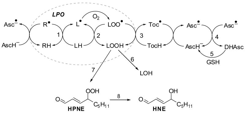 我们有一篇论文,其中展示了脂质过氧化反应的发生。维生素C基本上阻止了活性氧或活性自由基与脂质相互作用。维生素E也基本上控制着脂质过氧化。脂质过氧化物本身,也就是维生素C,正在回收维生素E。