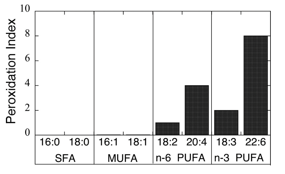 所以,随着时间的推移,这种情况急剧增加。我们对多不饱和脂肪酸的需求非常低,仅占卡路里的1%到2%,即便如此,这可能也高于实际摄入量,尤其是Omega-6脂肪酸。但这些脂肪也存在一些问题。它们极易受到氧化应激的损害。