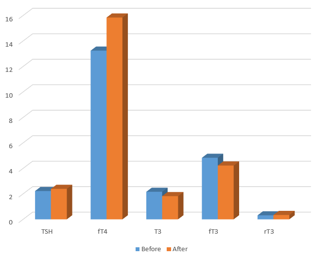 研究表明,进行 12 周的生酮饮食可以使 T3 和 fT3 值分别显著降低 13.4% 和 10.6%。还使 fT4 增加了 12.1%,略微增加了 rT3 ( R )。总而言之,会显著降低 T3/T4 和 T3/rT3 比率,使人处于甲状腺功能减退的状态。